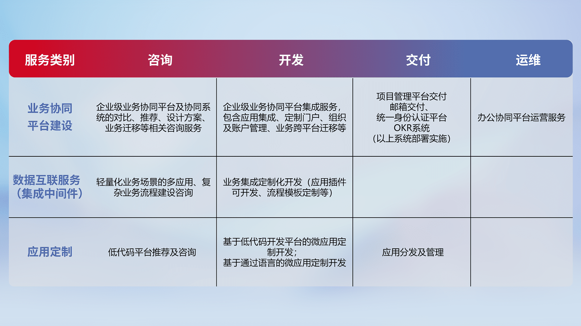 针对钉钉、、企微、、、、IDaas等平台级产品提供产品的规划、、、、方案、、、、交付、、、定制化开发等服务,,,,实现如统一协同办公、、智能客户服务、、、混合会议管理、、、、智能数据查询、、等业务场景,,实现数字化转型。。。。