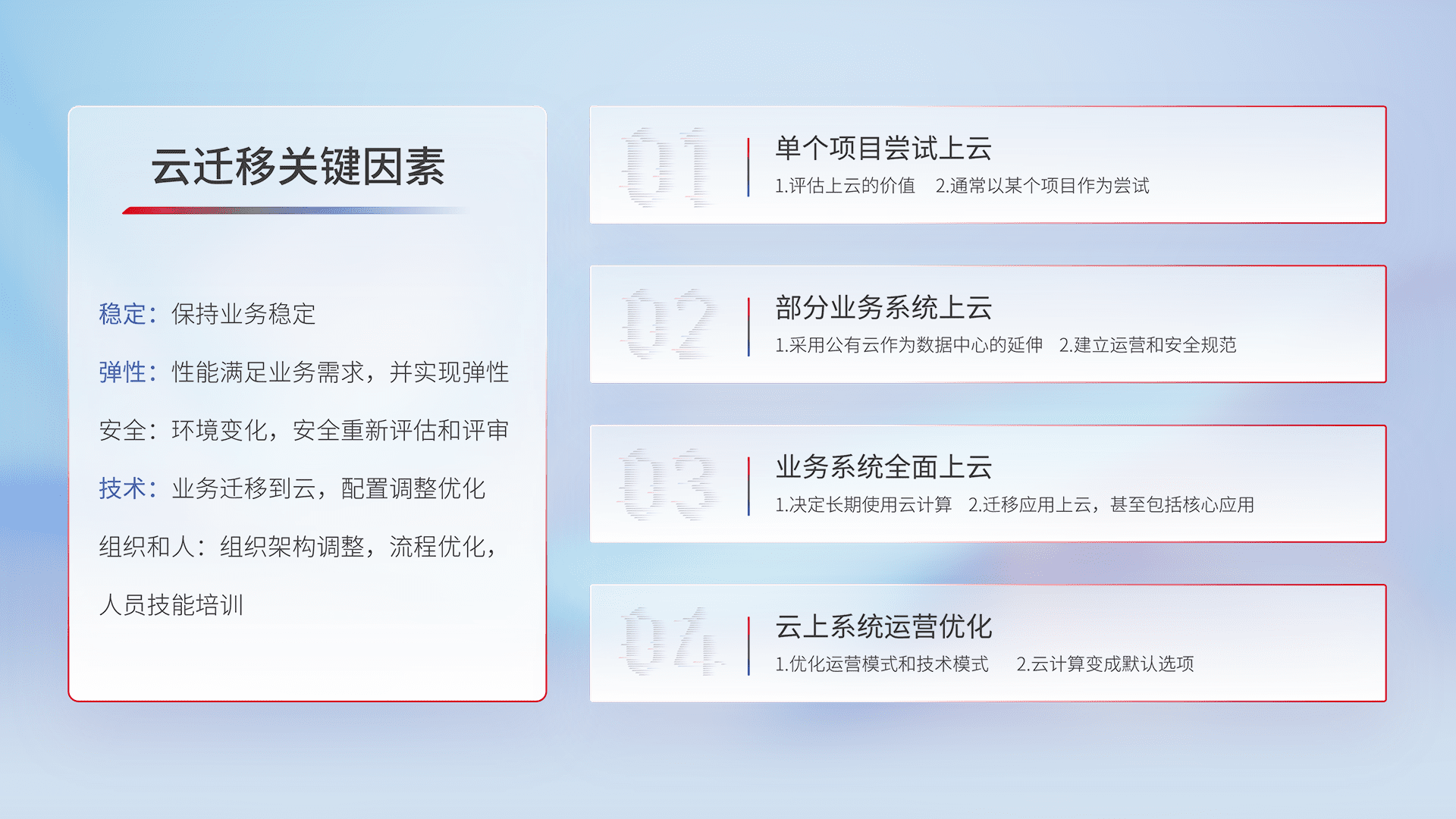 结合实际业务,,,,从规划设计、、、、云平台选型、、、、云原生改造、、、、数据迁移、、、集成交付,,迁移全过程为客户识别最佳上云路径,,,做好风险识别管理,,,设计网络架构、、、身份权限、、、、安全审计合规、、操作审计、、日志审计、、、监控告警策略、、、、多站点容灾设计等,,,,对云上基础设施进行整体规划,,,提升IT治理水平,,,以满足弹性、、高可用、、高性能的需求。。。