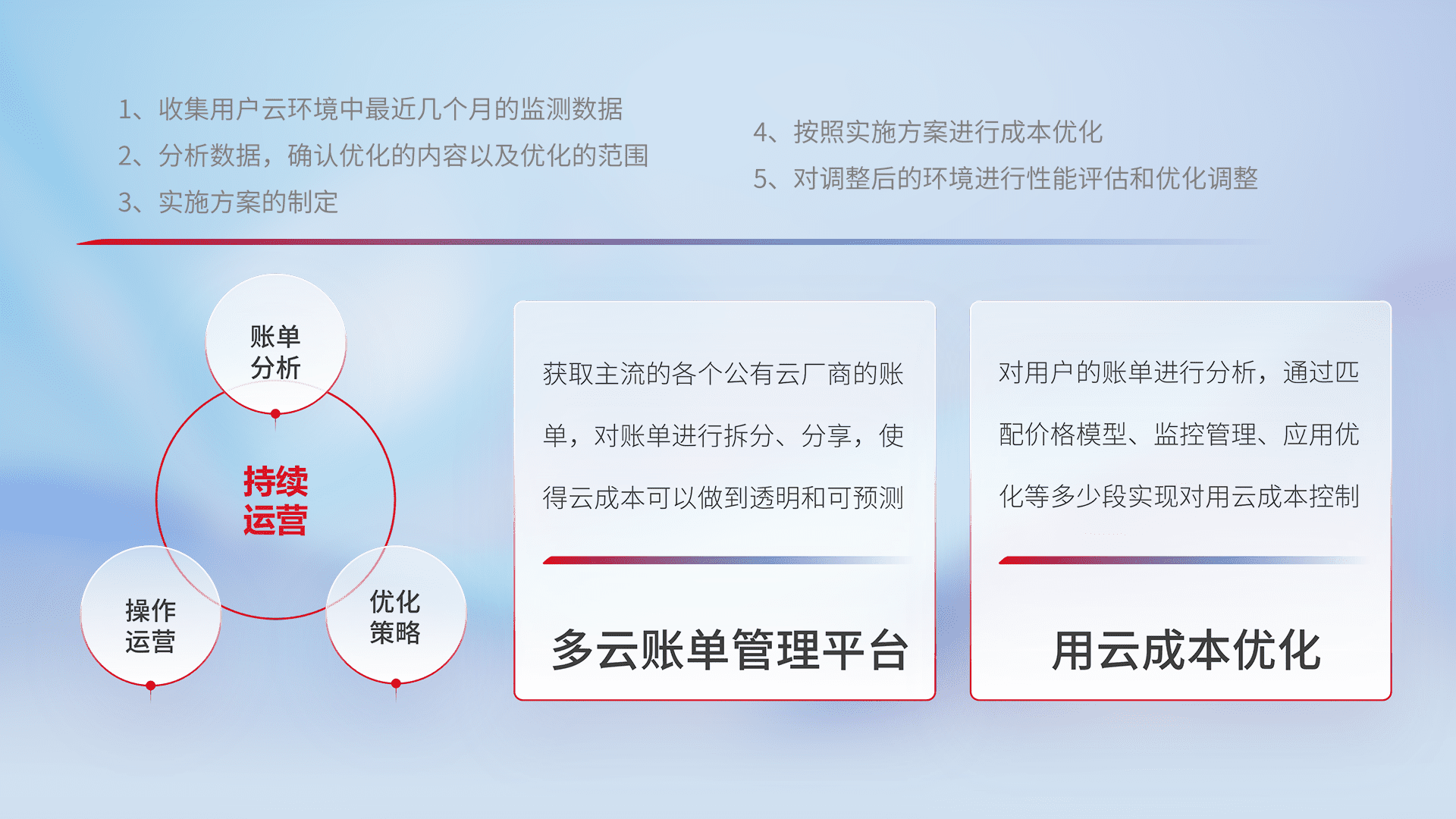 通过多云纳管,,,,以统一的资源数据模型把客户的云资源进行抽象和封装,,进而实现对多云资源的统一操作,,,保障云资源管理的可靠性、、稳定性与可用性。。量身定制化运维内容,,,,配置、、开发运维、、、补丁管理、、、备份、、、监控、、认证和访问管理、、、、审计和日常巡检等,,,,保障在用云过程中的可靠度,,,稳定度以及高可用率。。。