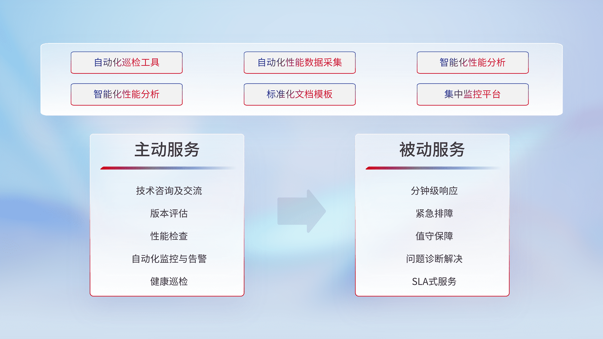 智能化工具和标准化文档,,,保障服务质量,,,,提供主动服务(包含技术咨询、、、、版本评估、、、、性能检查、、自动化监控与告警、、、、健康巡检)和被动服务包含(分钟级响应、、、、紧急排障、、值守保障、、问题诊断解决、、SLA服务)。。。